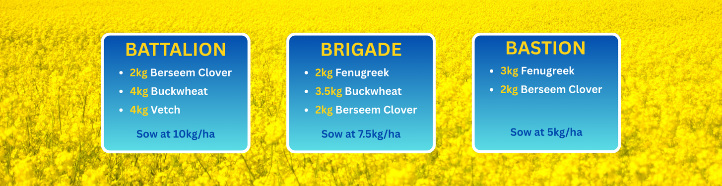 Fenugreek will help with nitrogen fixation and it is thought that the scent of the plant may confuse cabbage stem flea beetle and mask the OSR crop. Berseem clover is included as it will assist with root penetration. Both species will be easily killed by frost.